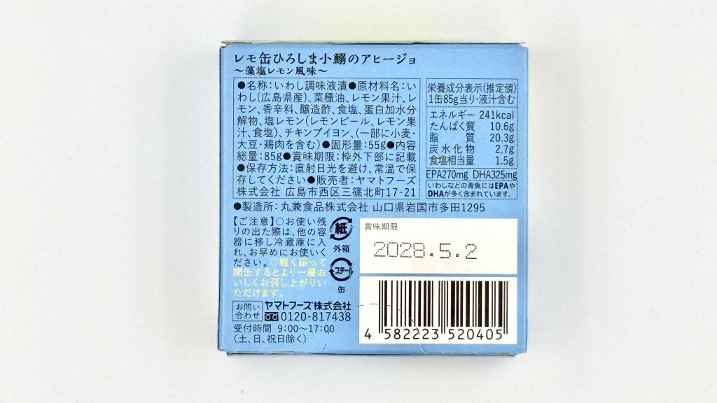 レモ缶ひろしま小鰯のアヒージョ ~藻塩レモン風味~ 5分温めてさらにこくが増します! ※おすすめの温め方 鍋に缶詰がかぶるくらいの湯を沸かす。 火を止め、缶詰の蓋を開けずに入れる。 そのまま5分おいたらできあがり! 【ヤケド注意!】 引き